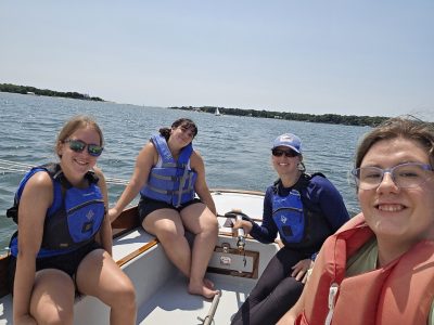 Haley (right, red life jacket) goes sailing for the first time